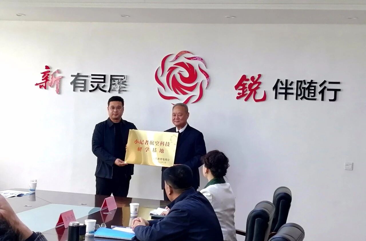 推介会隆重举行了“小记者航空研学基地”授牌仪式。山东教育电视台青少部潍坊记者站主任季国忠将“小记者航空研学基地”的牌匾交到新锐通航党委书记梁有福手中。